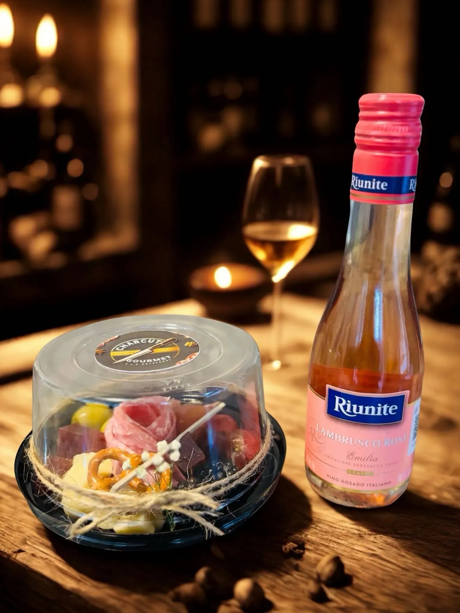 Un delicado encuentro entre la frescura del Lambrusco Rosé Riunite, de burbuja sutil y notas afrutadas, con una selección exclusiva de quesos finos, charcutería premium, fruta fresca y bocados crujientes.